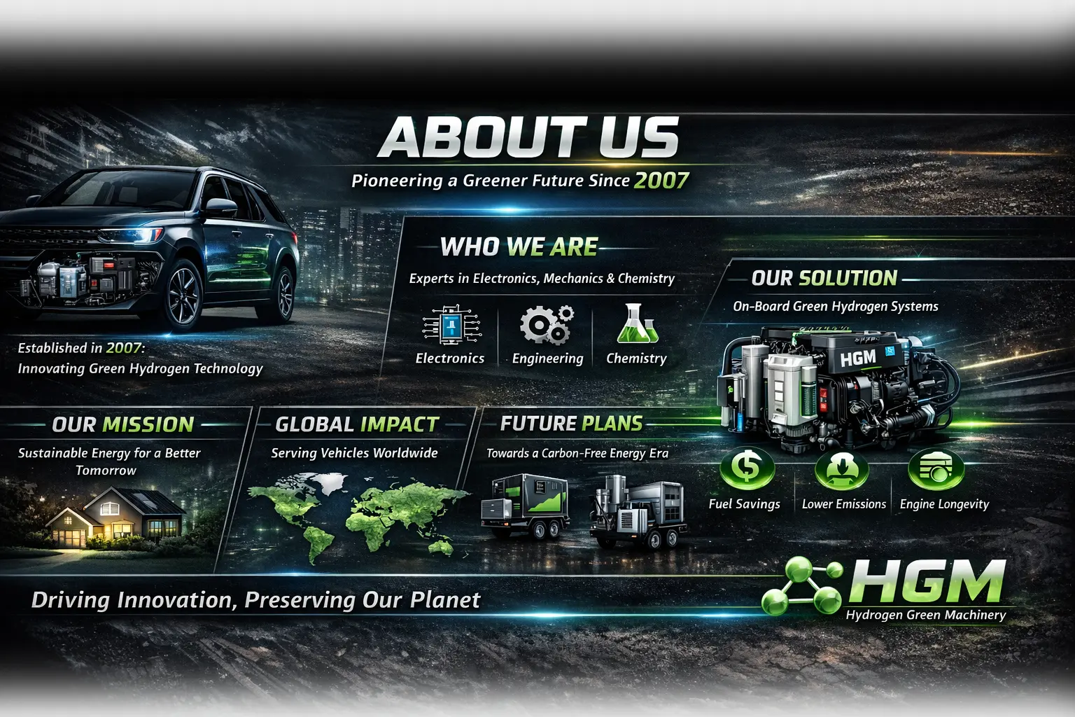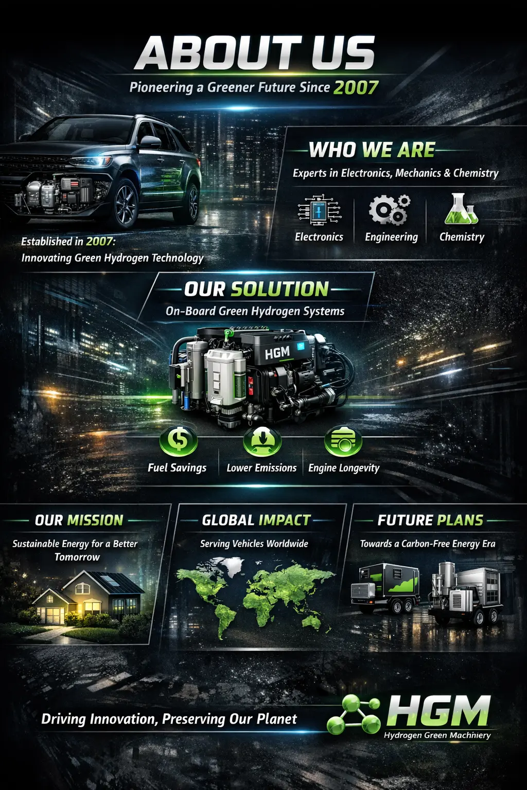 Artboard 1 Contact Us Click the button below to contact us for questions, support, or inquiries about our services and solutions. We are here to help and guide you with any requests you may have quickly and efficiently. Learn more Home Pioneering Green Hydrogen Solutions Clean energy innovation since 2007 Hydrogen systems for industry and mobility Reducing emissions and fuel consumption Building a sustainable, zero-carbon future Learn more Articles Click the button below to read our articles covering insights, updates, and useful information for everyone. Discover helpful tips, trends, and best practices to improve knowledge and get inspired in your work. Learn more About Us Click the button below to read about our vision, mission, and core values guiding all we do daily. Discover the long-term goals we aim to achieve to improve services and positively impact the community. Learn more Products Click the button below to explore our products, designed for quality and innovation in every category we offer. You will discover features, options, and benefits crafted to meet your needs and enhance your experience with us. Learn more Cooperation Click the button below to explore our cooperation opportunities and learn about our business plans available for download and easy implementation. Discover ways to collaborate, partner, and achieve shared goals efficiently. Learn more Agencies Click the button below to see our agencies around the world and learn how we provide quality services in regions globally. See offices, partnerships, and locations strengthening our network. Learn more